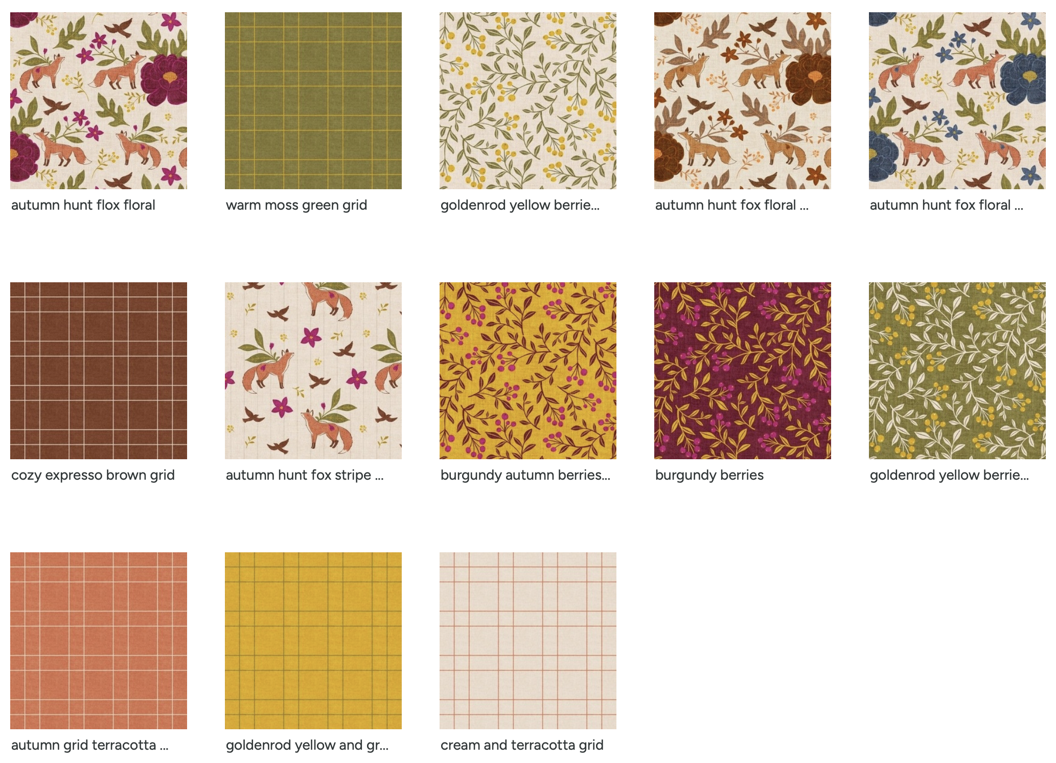 You can explore the full Autumn Fox Floral Collection here on Spoonflower. Every design is available as fabric (cotton, linen, or performance options), wallpaper, or ready-made home décor items like pillows and curtains.